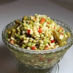 A warm lovely vinaigrette dressing, with just a bit of sugar, is poured over a bowl of fresh and canned veggies and popped into the fridge. Twenty-four hours you have green bean-corn-celery-pea-corn-pimento-delight.